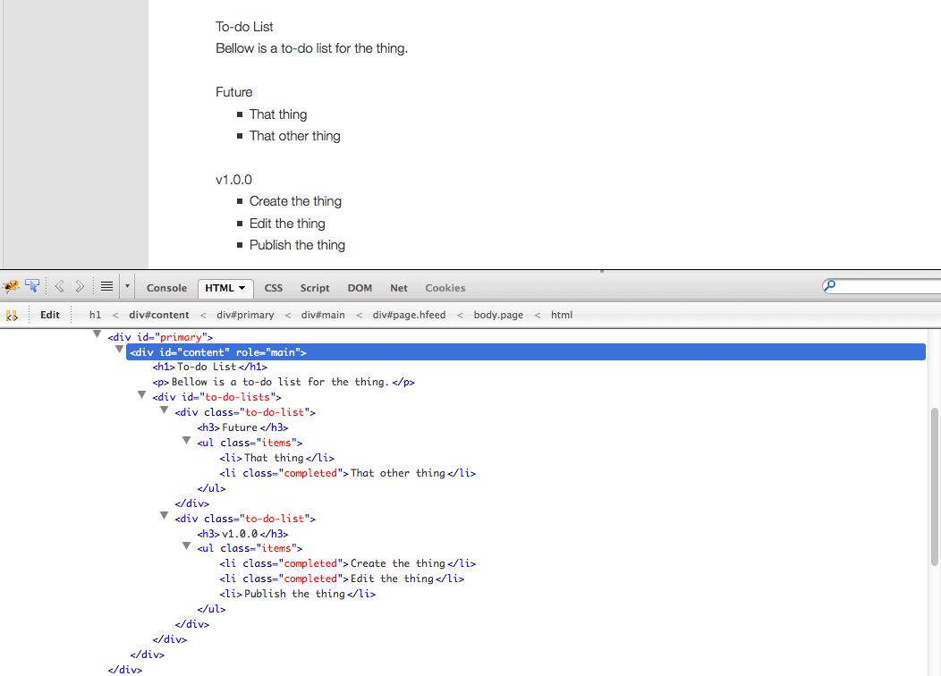 <?php get_footer(); ?>Here is a screenshot showing the HTML produced from the above code.