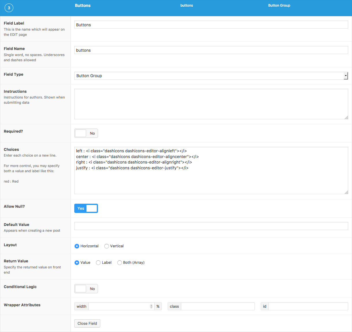 The Button Group field provides a neat UI for selecting a value.