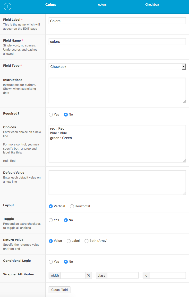 $field = get_field_object('colors');