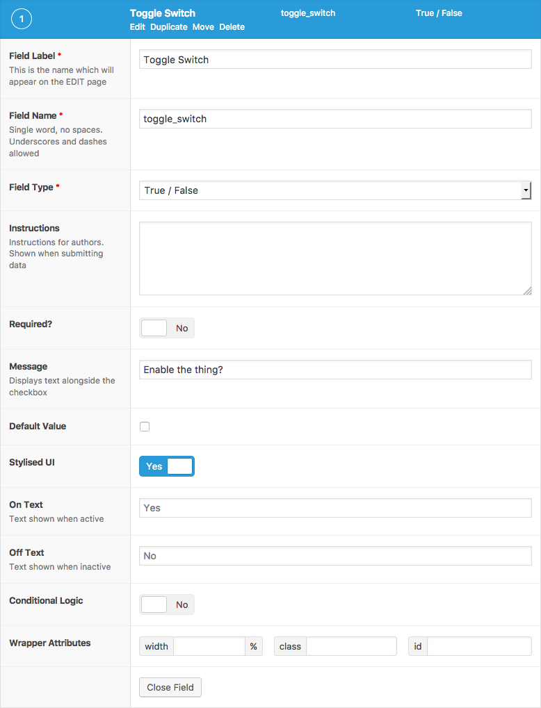 The text displayed within the stylized toggle switch. Defaults to ‘No’. HTML may be entered for icons or custom markup.