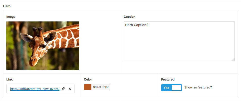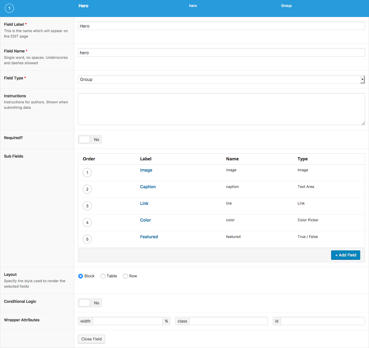 The Group field uses both the parent and child field names when saving and loading values. For example, a Group field named ‘hero’ with a sub field named ‘image’ will be saved to the database using the meta name ‘hero_image’.
