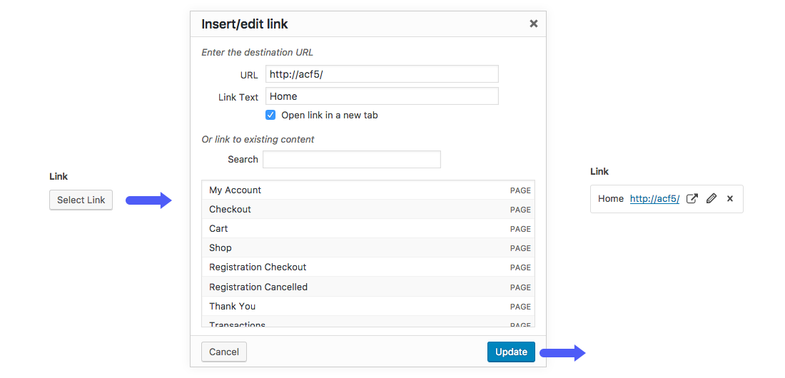 The Link field allows a link to be selected or defined (url, title, target) by using the native WordPress link popup.