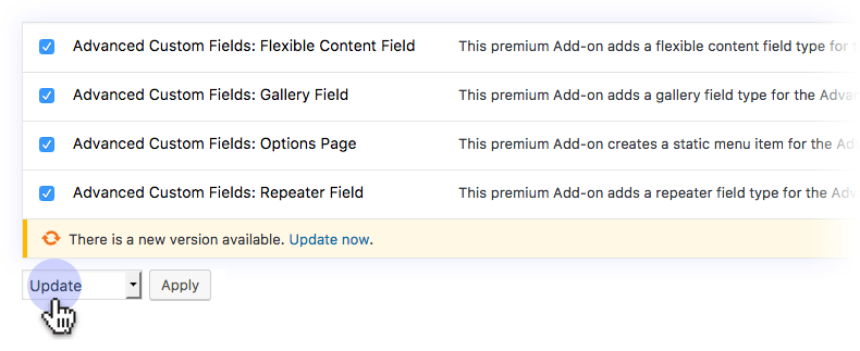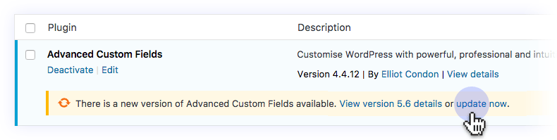 Log into your WordPress website and use the Plugins page to view and update the Advanced Custom Fields plugin.