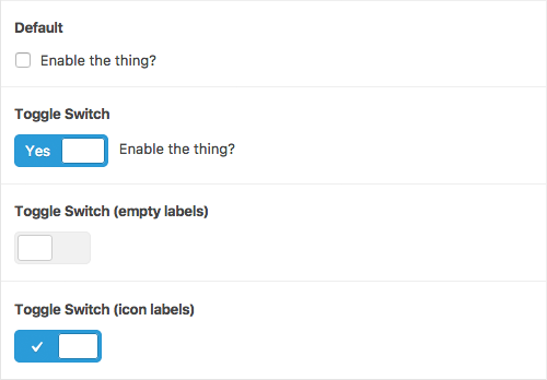 The text displayed within the stylized toggle switch. Defaults to ‘Yes’. HTML may be entered for icons or custom markup. -