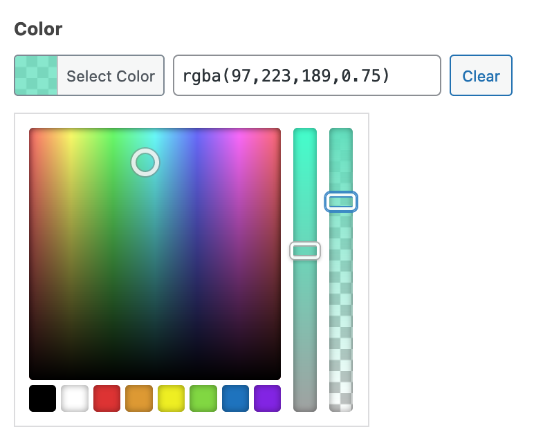 Enable transparency control on the color picker. If enabled the Return format options switch to RGBA string or RGBA array.