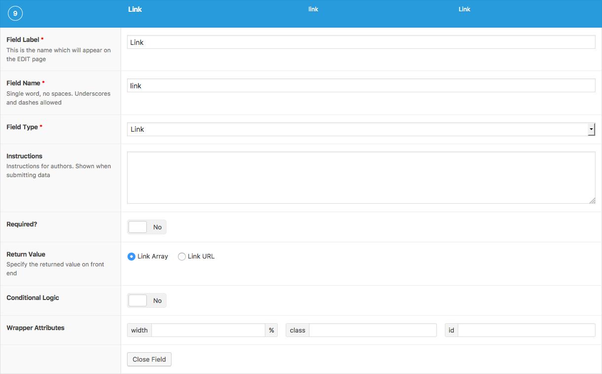 The Link field allows a link to be selected or defined (url, title, target) by using the native WordPress link popup.